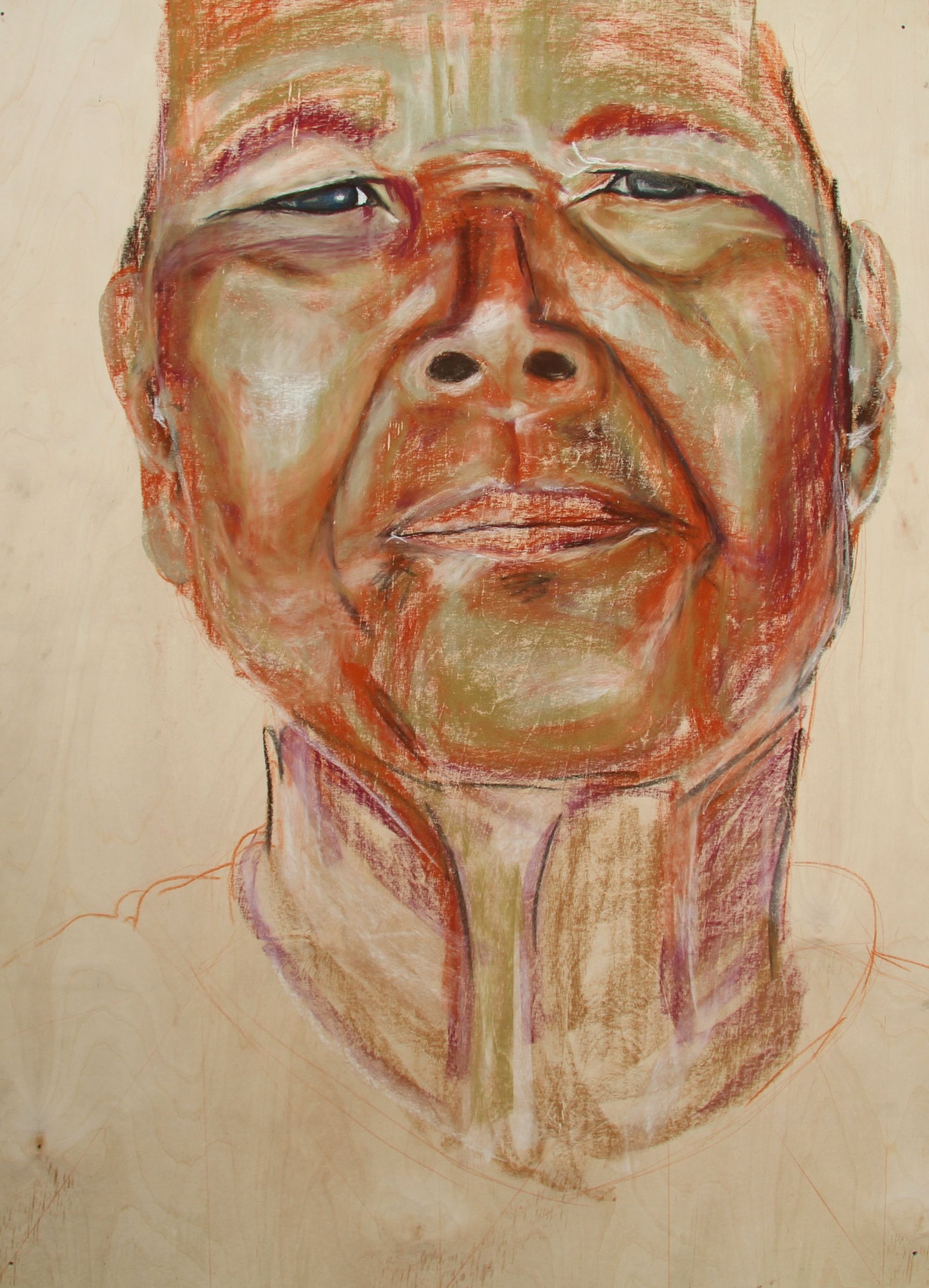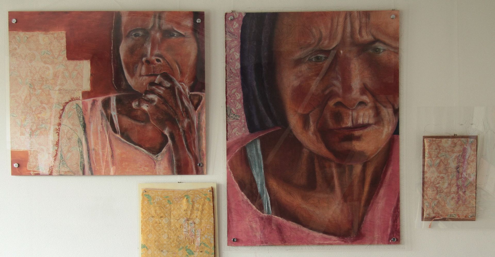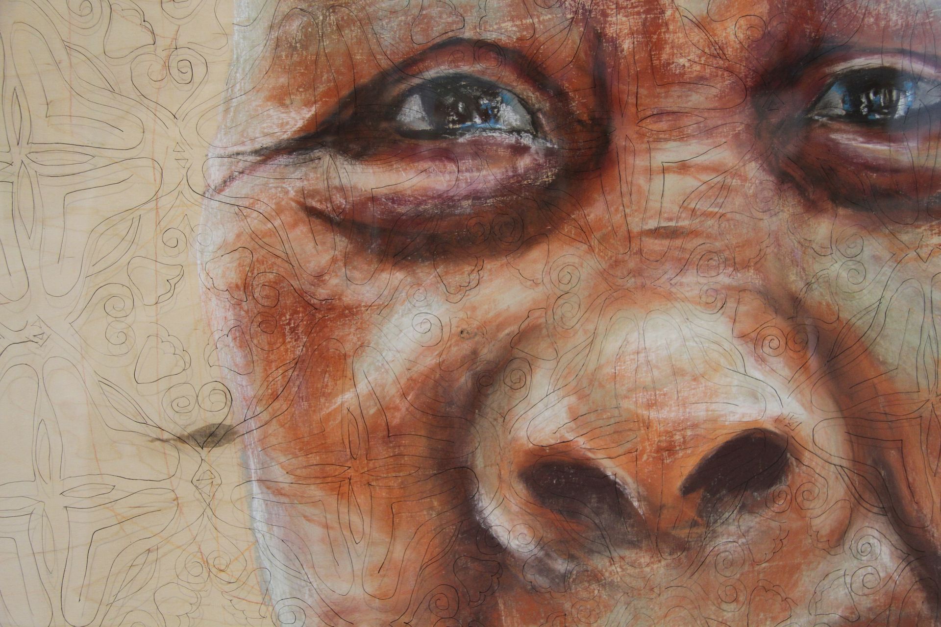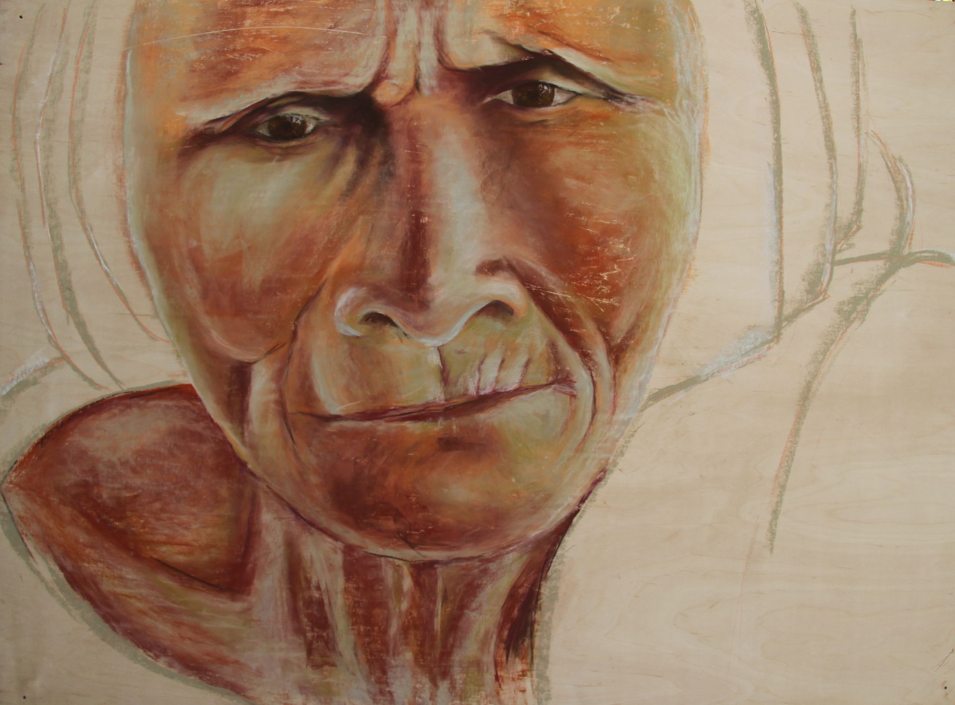 Het pastelkrijt boetseert het portret. Je ziet meerdere lagen: de ondergrond, de nerven van het hout, de structuren, de vaste patronen van het leven. Daarna de vrouw, het geleefde leven dat je ziet in haar gezicht. Dan haar attributen, haar sarong, vele jaren gedragen als bescherming, als sieraad.