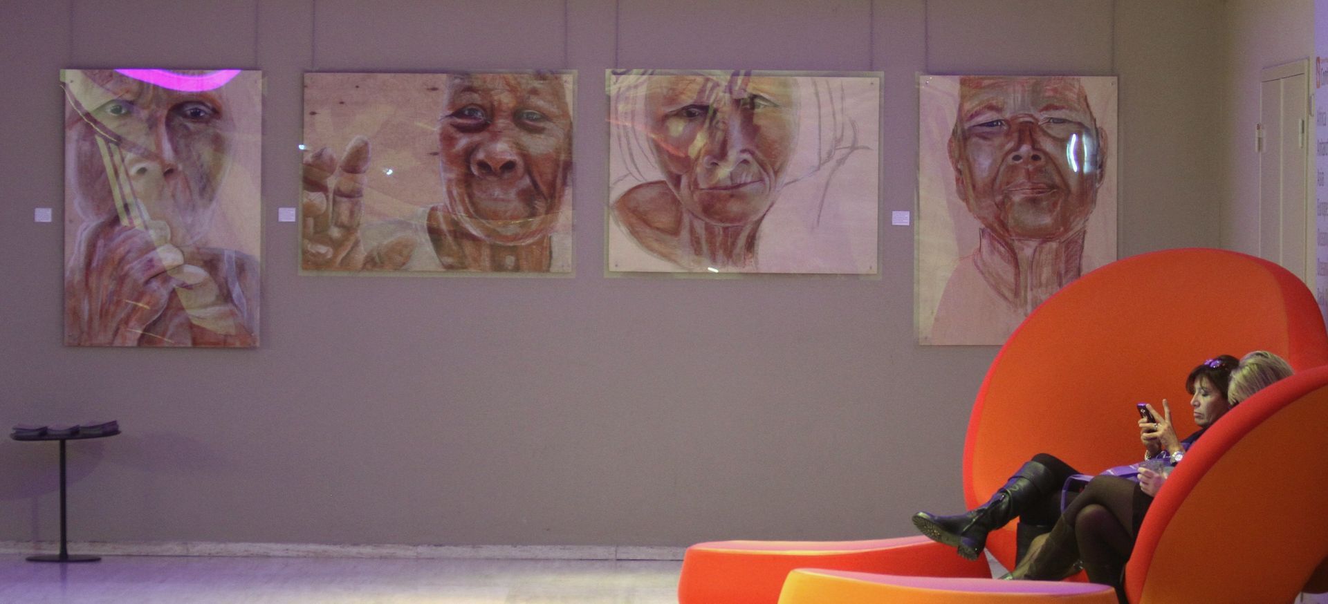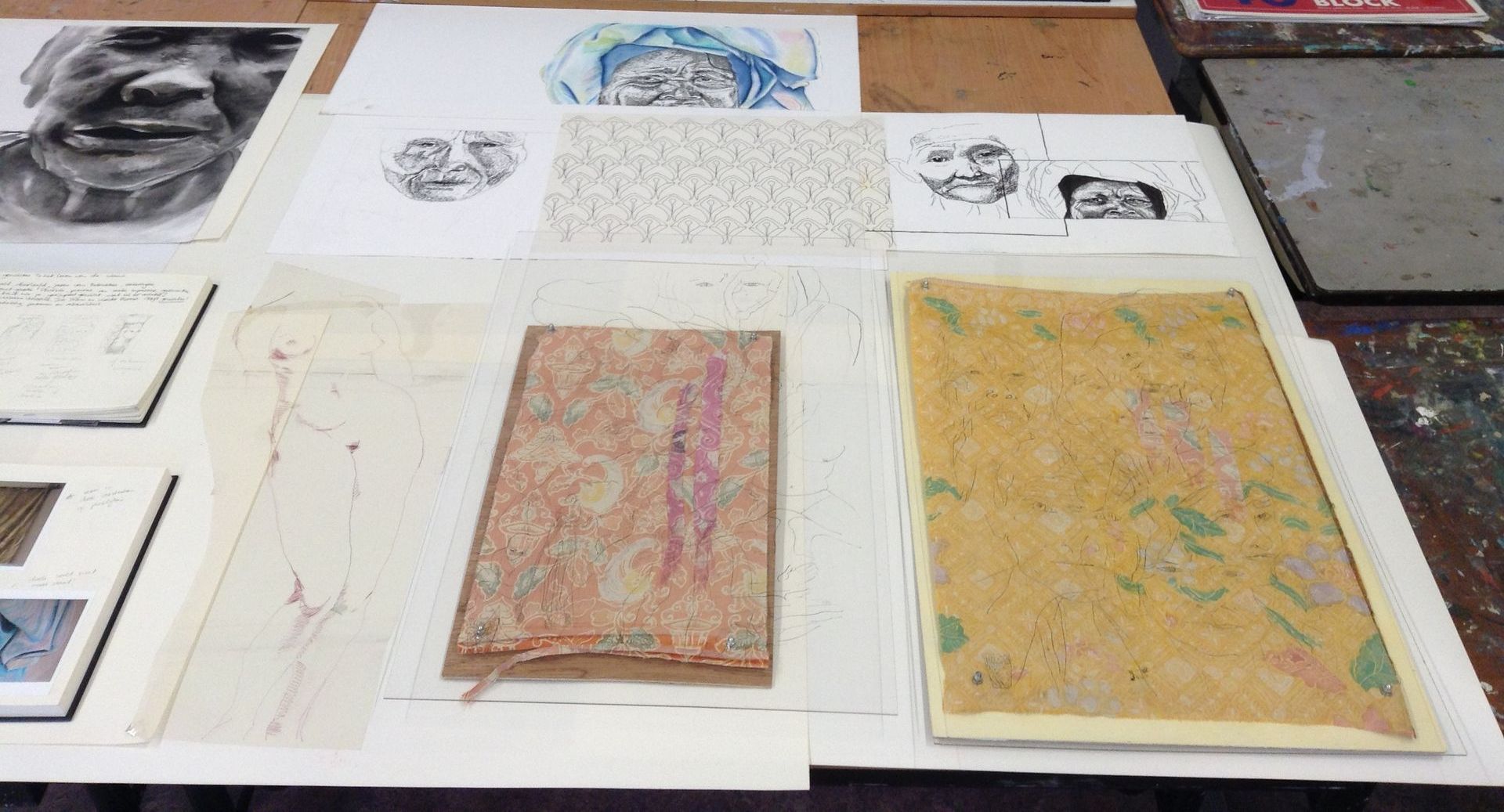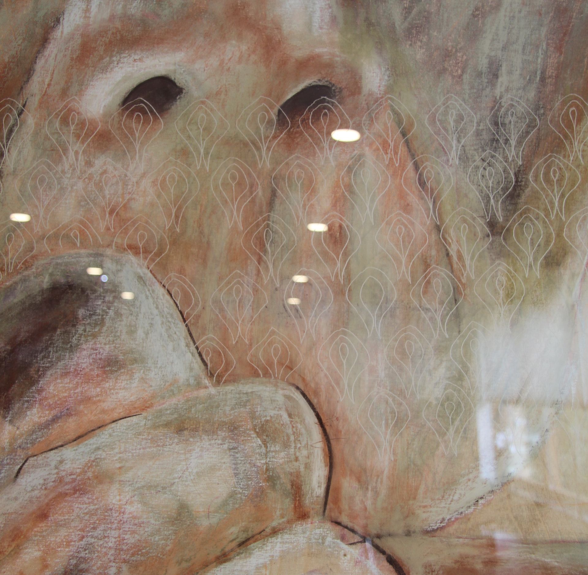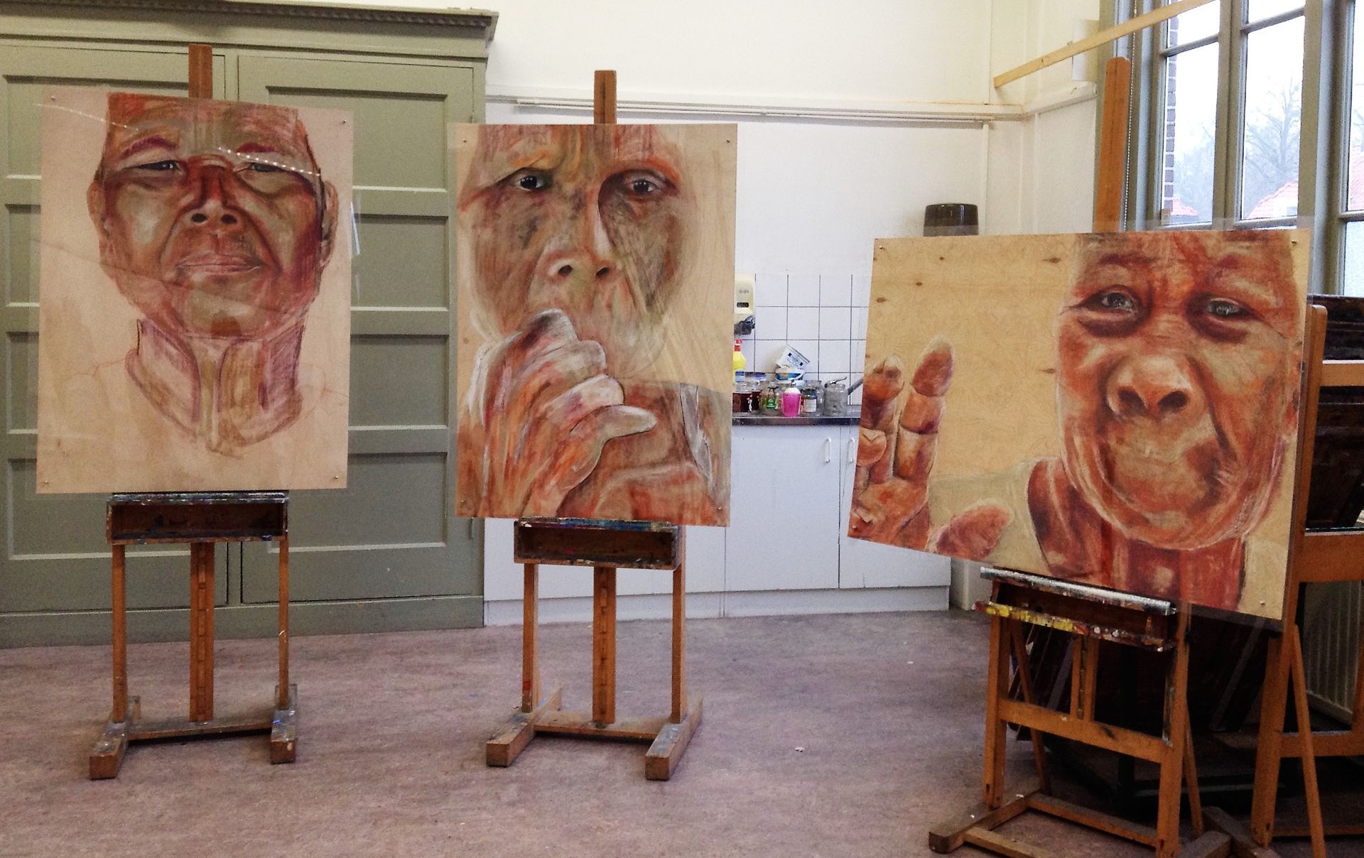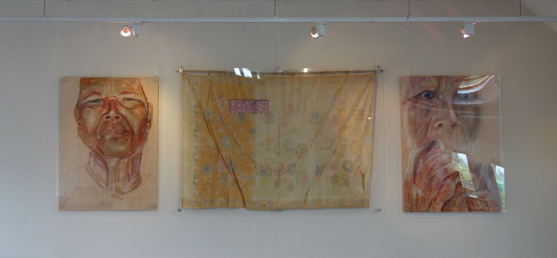 Het pastelkrijt boetseert het portret. Je ziet meerdere lagen: de ondergrond, de nerven van het hout, de structuren, de vaste patronen van het leven. Daarna de vrouw, het geleefde leven dat je ziet in haar gezicht. Dan haar attributen, haar sarong, vele jaren gedragen als bescherming, als sieraad.