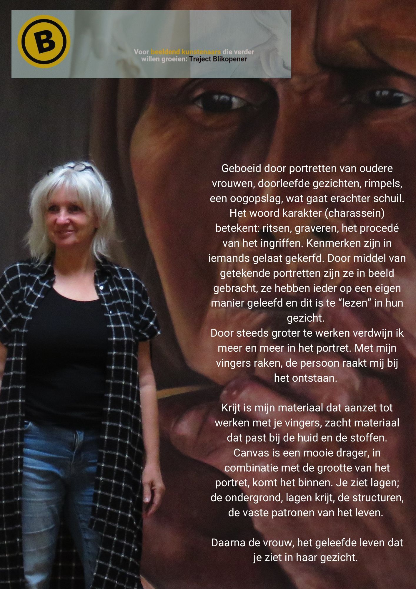 Contact ervaren, een blik in je ogen, wie ben je, wat denk je, hoe heb je geleefd? Een verhaal dat gaat over vrouw zijn, je leven leven, soms onder omstandigheden van macht en onmacht. Wat een kracht om toch door te gaan en het leven op te pakken. Dit leven tekent zich af in een gezicht